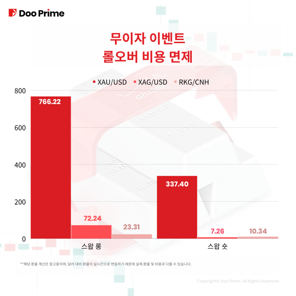 Doo Prime 롤오버 면제 이벤트는 2022년 3월 26일부터 진행되었습니다. 2022년 7월2일 이후 Doo Prime은 메이저 통화쌍도 이벤트 범위에 포함시켰습니다. 이로써 메이저 통화쌍, 귀금속, 주가지수 현물, 미국 주식 모두 롤오버 면제 종목입니다.