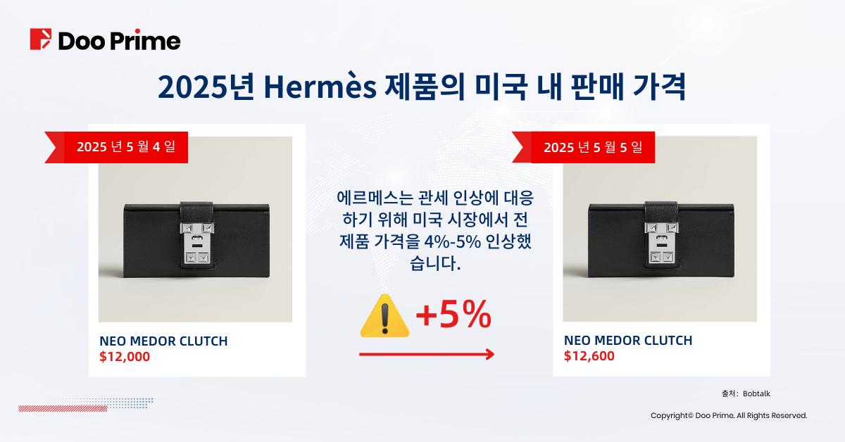 프리미엄·희소성 전략을 고수하는 Hermès(에르메스) 는 5월 1일부터 미국 시장 전 제품 가격을 4~5% 인상했습니다. 이는 기존의 연간 정기 가격 인상률(6~7%) 에 더해진 추가 조치로, 관세 영향을 상쇄하기 위한 대응입니다.