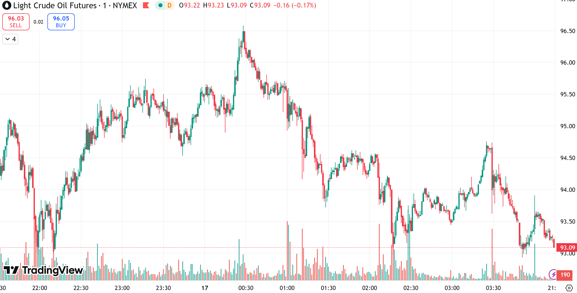 周二亚市早盘,现货黄金交投于 5005.87 美元/盎司附近,金价周一小幅回落,因市场担心中东冲突持续可能推高通胀,进而导致利率在更长时间内维持高位,这一情绪盖过了美元走软带来的支撑;美原油交投于95.25 美元/桶附近,油价周一下跌,因有部分船只通过关键的霍尔木兹海峡,暂时缓解了市场对供应中断的极端担忧,同时受到近月合约到期前的抛售行为影响。