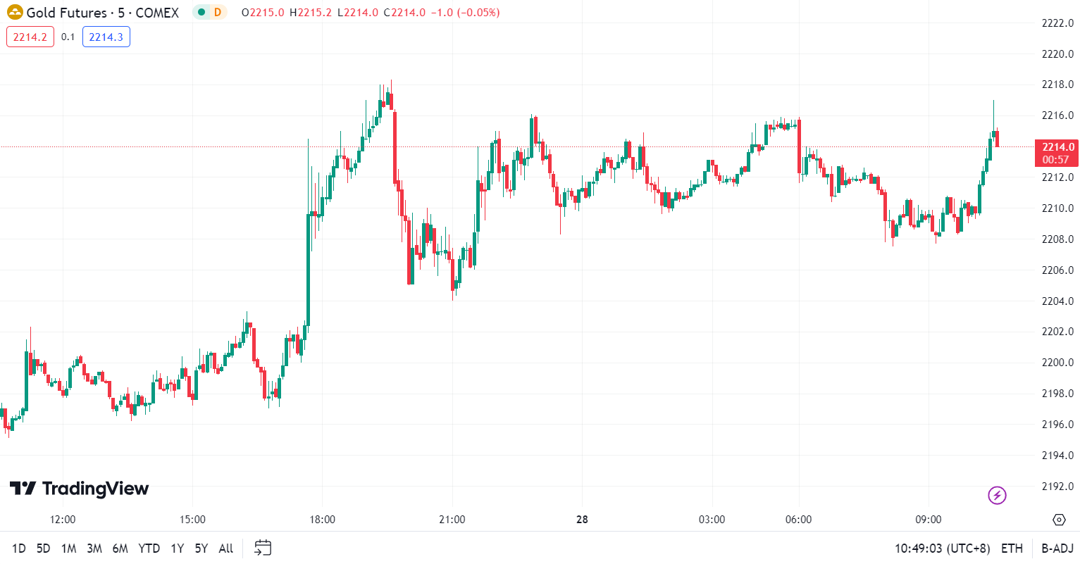 现货黄金小幅走弱,目前交投于 2190.88 美元/盎司附近,跌幅约 0.18%,因美联储理事称需要“几个月”更好的通胀数据才能进行降息。金价周三上涨 0.74%,日线录得三连阳,因为投资者普遍预计美联储将在 6月份开始降息。