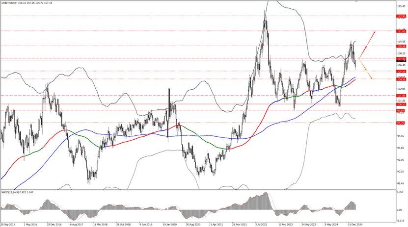 - 本周,如果美指在 107.50 一线附近承压下行,则依次关注 105.56 和 104.36 两个位置的支撑力度;