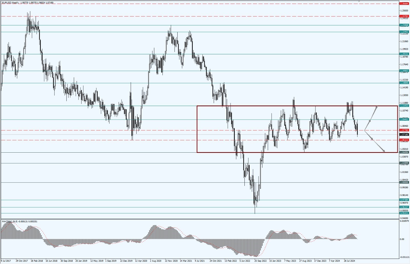 - 近期欧元下行力度增强,整体空头势头强劲,本周关注区间内的中枢位 1.0778 一线;