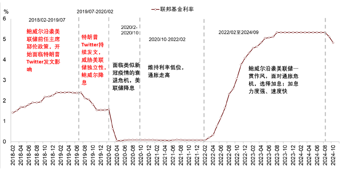 货币政策方面,特朗普的贸易和财政政策加剧通胀再次上行的风险,可能限制美联储降息的幅度。但同时,特朗普也可能实质性削弱美联储的独立性。因为,特朗普扩大美国经济的政治诉求,很大程度上依赖持续的财政扩张,而在近期财政融资成本不断上行的情况下,这一过程更加需要比实际经济增长和通胀水平更为鸽派的货币政策配合,恐进一步加剧通胀压力。鲍威尔的第二任期将持续至 2026 年初,而特朗普已于今年初表态,上任后将不再提名鲍威尔为下一任美联储主席。