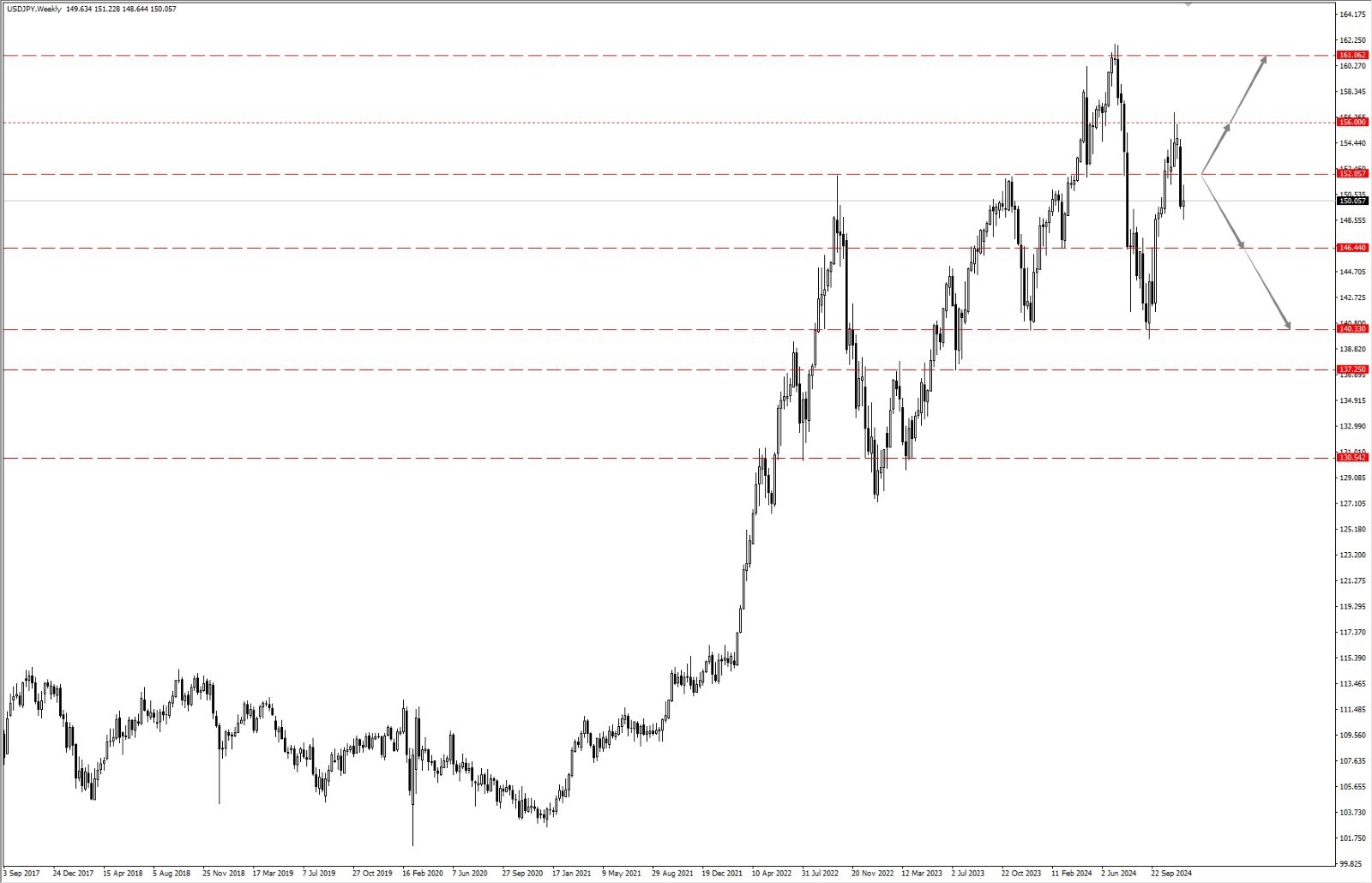 - 如果美元兑日元运行于 152.05 一线下方,则依次关注 146.44 和 140.33 两个位置的支撑力度;