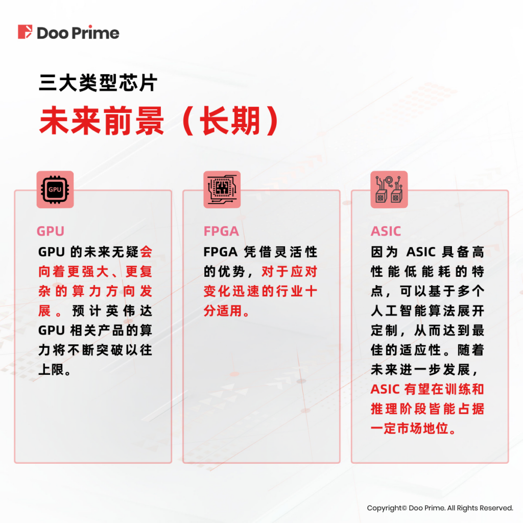 长期来看,无论是 GPU、FPGA 或是 ASIC,这三种技术路线均各有千秋。GPU 的未来无疑会向着更强大、更复杂的算力方向发展。而 FPGA 凭借灵活性的优势,对于应对变化迅速的行业十分适用。而 ASIC 在当前阶段运用较少,却在未来长远来看会十分适用于人工智能行业。因为 ASIC 具备高性能低能耗的特点,可以基于多个人工智能算法展开定制,从而针对不同环境达到最佳的适应性。随着未来进一步发展,ASIC 有望在训练和推理阶段皆能占据一定市场地位。
