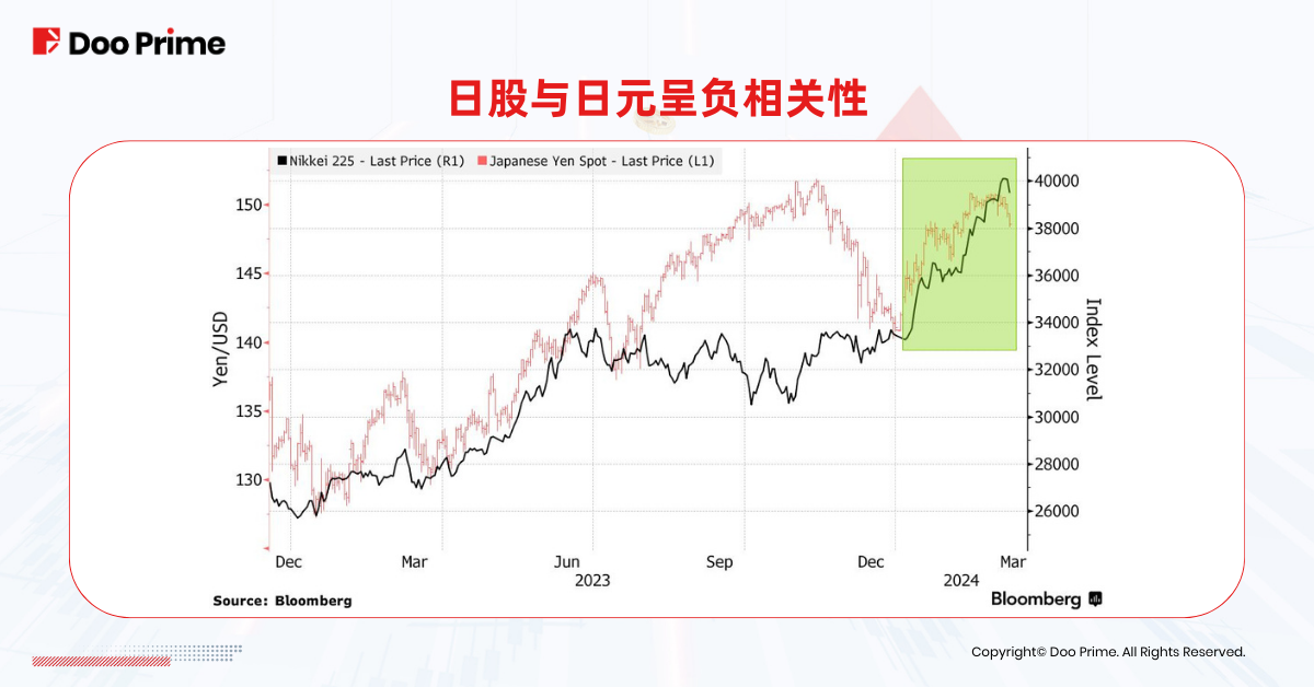 日经指数与日元之间存在一定的负相关性,即日经指数走强时,日元会呈现贬值趋势;相反,如果日元升值,日经指数则会出现下跌。