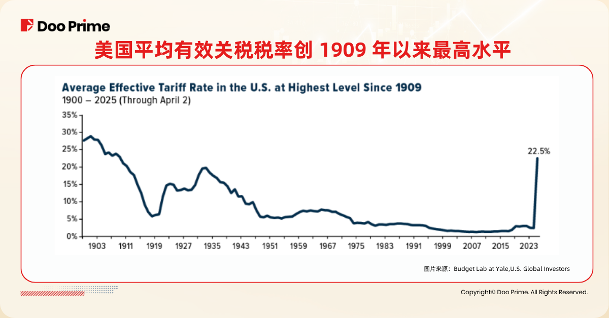 根据耶鲁大学实验室测算,截至 4 月 2 日,美国的平均有效关税税率为 22.5%,高于原本市场预估的 10%,是自 1909 年以来的最高水平。