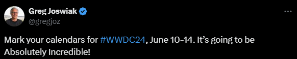 苹果全球营销高级副总裁格雷格·乔斯维克(Greg Joswiak)在社交媒体上写道,“在您的日历标记上WWDC24吧。这场活动无疑是很棒的!”眼尖的网友很快发现,乔斯维克特意把“Absolutely Incredible”的首字母拼成大写,合起来就是当下最火的科技概念——“AI”(人工智能)。