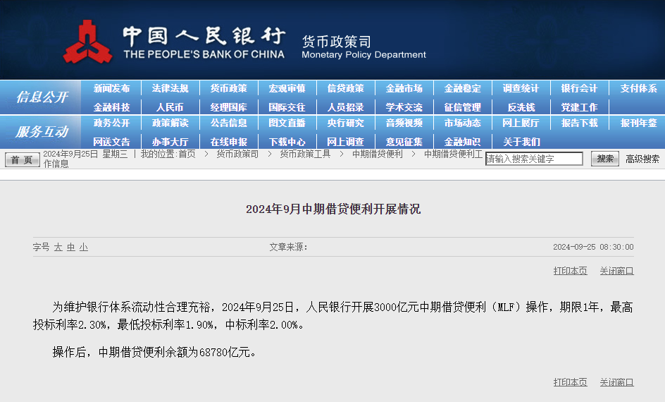 中国央行公告称,为维护银行体系流动性合理充裕,开展 3000 亿元中期借贷便利(MLF)操作,期限 1 年,最高投标利率 2.30%,最低投标利率 1.90%,中标利率 2.00%,较此前下调 30 个基点。