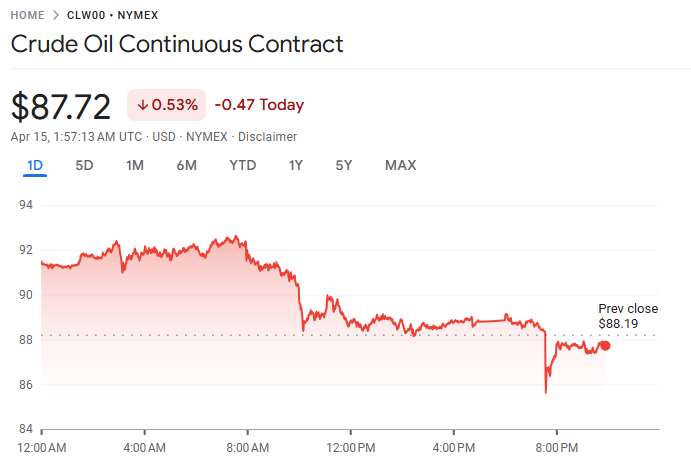 国际油价大幅下跌,市场出现迹象显示美国与伊朗正积极谋求安排第二轮和平谈判,缓解地缘政治紧张局势。布伦特原油期货下跌 4.6%,收于每桶 95 美元以下;西得克萨斯中质原油(WTI)跌幅更大,达到 7.9%,报每桶约 91 美元。