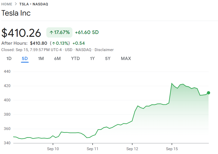 行业动态 | 9 月 15 日至 16 日, 马斯克斥资 10 亿美元增持特斯拉股票 ; Alphabet 市值突破 3 万亿美元大关; CoreWeave 获英伟达保底采购协议,股价一度飙升近 8% ;美银分析师预测美联储将在本周降息,并在 12 月再度降息;金价受降息预期推动再创纪录高位。