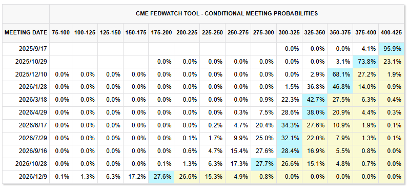 此外,上周最新公布的消费者物价数据低于预期,对联储关注的核心通胀指标影响有限。交易员目前几乎确定,在为期两天的会议结束之际,美联储将启动自去年 12 月以来的首次降息。市场普遍认为,在劳动力市场走弱背景下,政策宽松能够刺激投资和就业,但也存在推升通胀的风险。