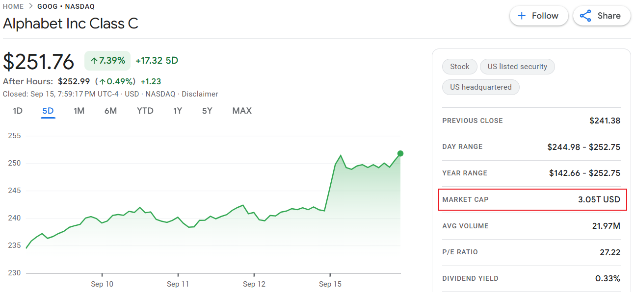 Google 母公司 Alphabet (GOOG) 周一股价表现强劲,收盘上涨 4% 报 251 美元,公司市值首度突破 3 万亿美元关口,成为继英伟达(NVDA)、微软(MSFT)及苹果(AAPL)之后,第 4 家跻身该水平的美股企业。