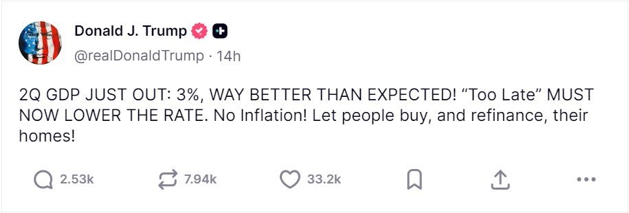 数据公布后,特朗普立即发声催促降息。他表示:“第二季度 GDP 刚刚出炉,3%,远远好于预期!‘太迟先生’ 现在必须降低利率。没有通胀!让人们可以买房、进行再融资!”