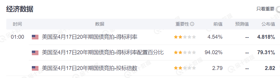同日,美国财政部拍卖 130 亿美元 20 年期国债,得标利率为 4.818%,创历史第二最高;预发行利率为 4.843%,比最终得标利率高了 2.5 个基点,创去年 1 月以来最大。
