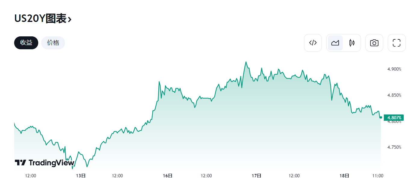 本次 20 年期美债拍卖多个数据亮眼,对市场构成提振。美国 20 年期国债收益率短线下挫超 2 个基点,跌穿 4.82%,最低触及 4.8162%,日内整体跌 7 个基点。