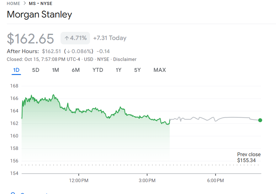 消息公布后,摩根士丹利(MS)股价在美股盘前上涨近 5%,收盘时报 162.31 美元,上涨 4.49%,年内涨幅已达 24%,表现显著优于金融板块整体。分析师认为,在并购活动复苏、市场交易活跃及财富管理扩张的支撑下,该行有望成为 2025 年华尔街表现最强的综合性金融机构之一。