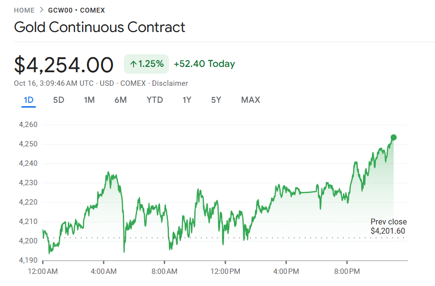 10 月 15 日至 16 日,受市场预期美联储即将降息及地缘政治紧张升温推动,投资者大举涌向避险资产,金价周三延续升势,首次突破每盎司 4200 美元关口。