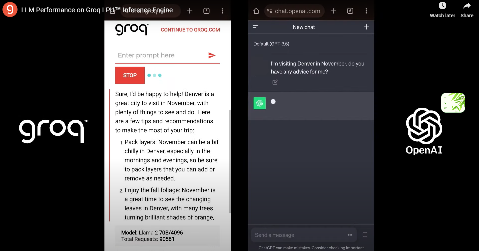 在 OpenAI 文生视频模型 Sora 引爆科技圈仅仅两天后,AI 芯片初创企业 Groq 开放了自家产品的免费试用,其芯片推理速度较英伟达 GPU 高 10 倍,而且但价格和耗电量都仅为英伟达的十分之一;其生成速度接近每秒 500 tokens,碾压 ChatGPT-3.5 约每秒 40 tokens 的速度。