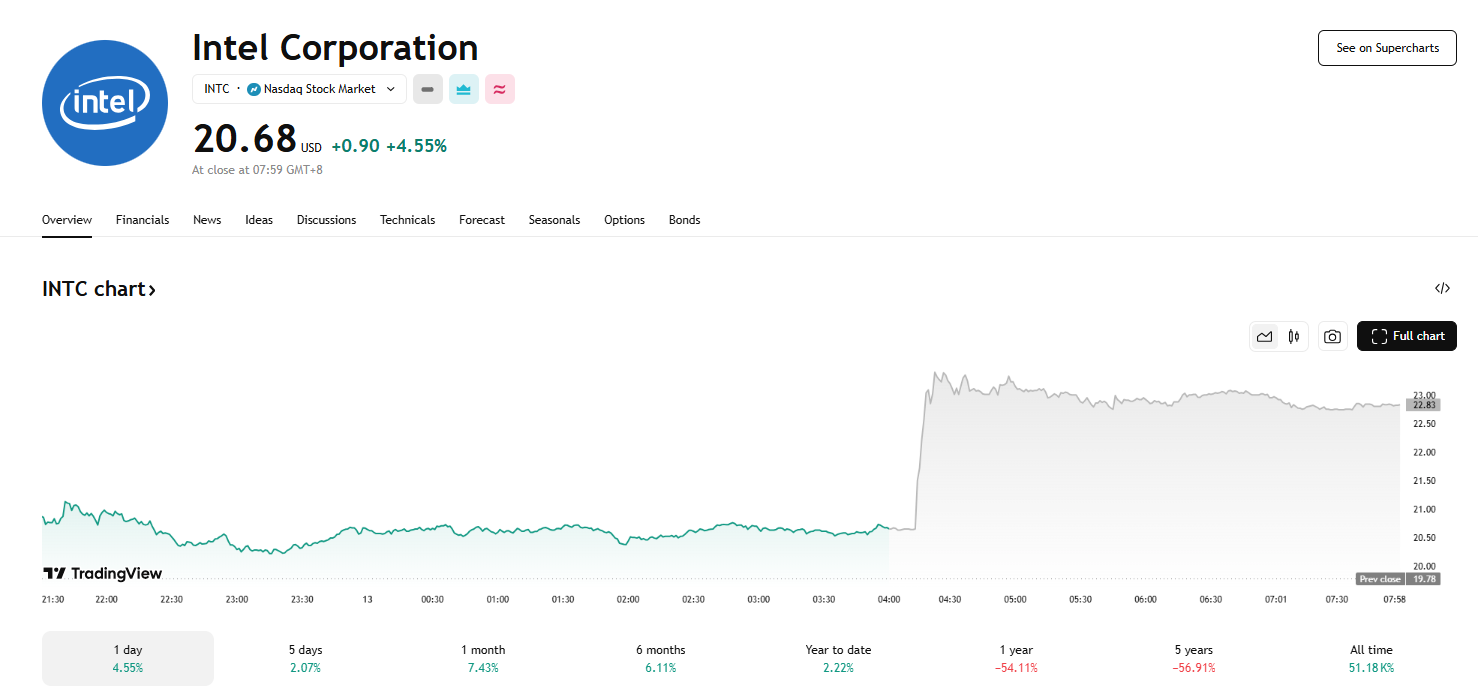 上述消息公布后,英特尔(INTC)股价盘后大涨逾 11%,该股在美股常规交易中已上涨 4.55%。