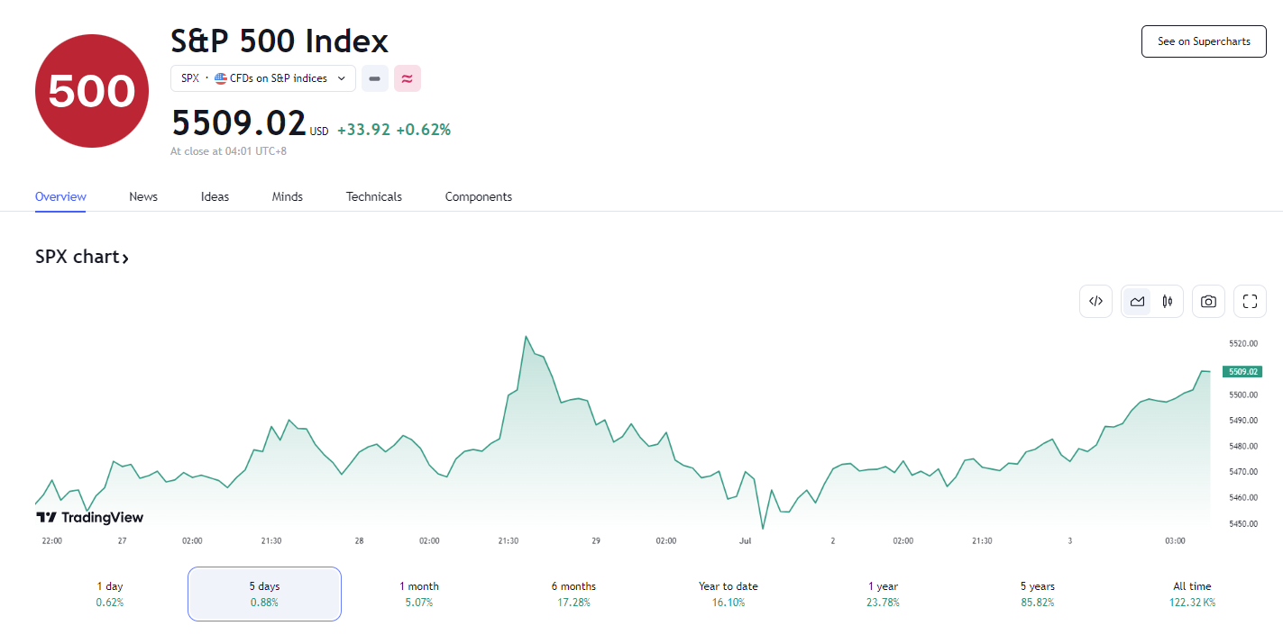美股低开高走,尾盘加速上行,标普史上首次收高于 5500 点,标普、纳指、亚马逊、苹果、微软齐创新高。
