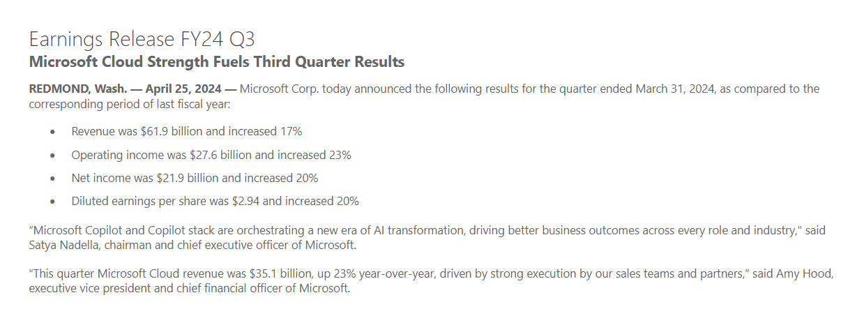 与此同时,微软发布了 2024 财年第三财季(即 2024 自然年一季度)财报,关键指标和各项业务全面超预期,其中整体微软云收入同比增 23% 至 351 亿美元,智能云收入增 21% 至 267 亿美元,Azure 收入逐季加速增长。