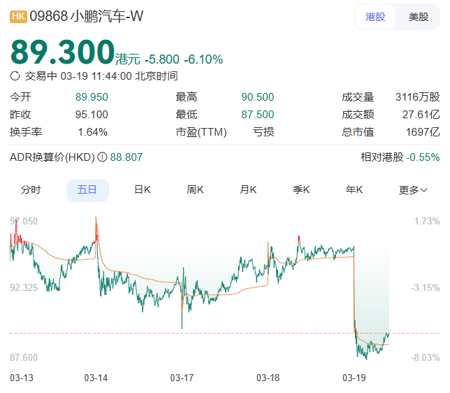 小鹏汽车-W(09868)绩后一度跌超 7%,报 87.5 港元,成交额 16.75 亿港元。