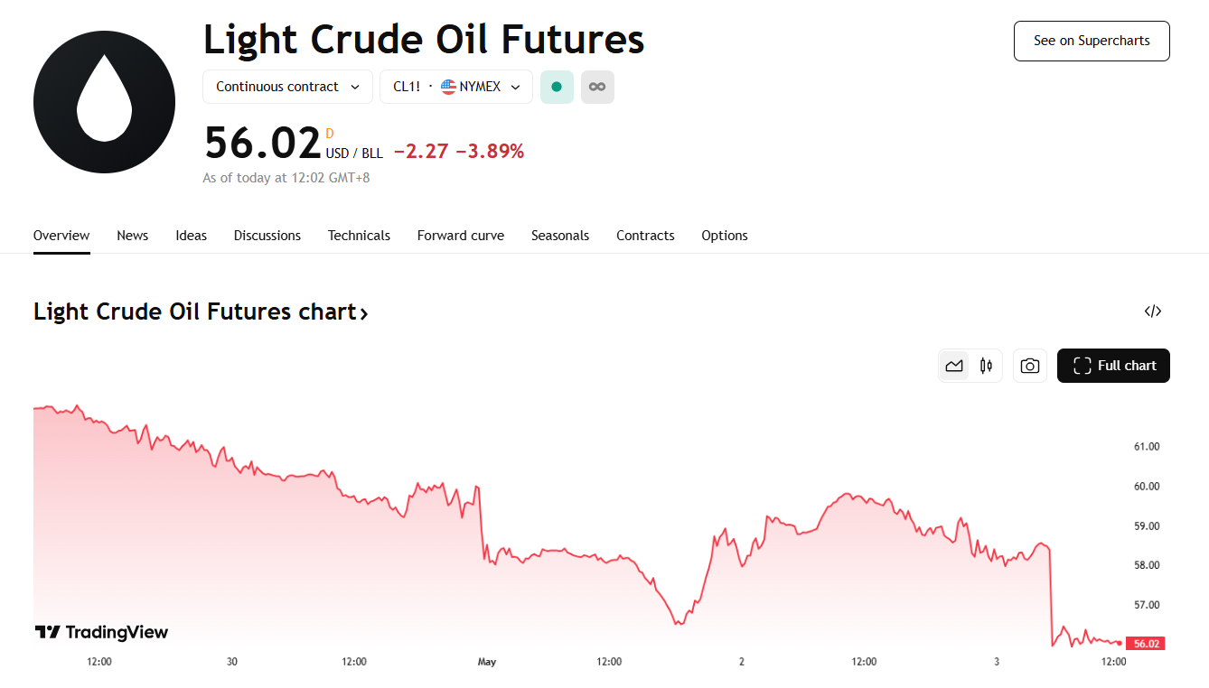 5 月 5 日,OPEC+ 连续两个月大幅增产令投资者措手不及,国际油价暴跌超 4%,其中美国原油期货价格大跌 4.27%,跌幅达 2.49 美元至每桶 56.30 美元;布伦特原油同样重挫 3.9%,下跌 2.39 美元至每桶 59.09 美元。