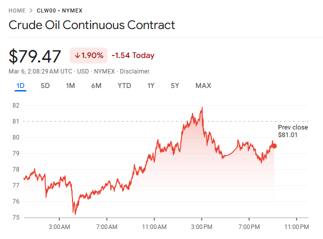 纽约原油突破每桶 80 美元,市场担忧中东冲突长期化