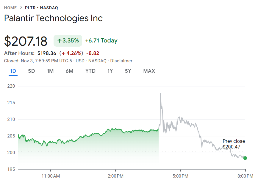 11 月 3 日至 4 日,Palantir(PLTR)公布第三季度财报,营收同比大增 62.6% 至 11.8 亿美元,超出市场预期的 10.9 亿美元;每股收益(EPS)0.21 美元,同样优于预期的 0.17 美元。