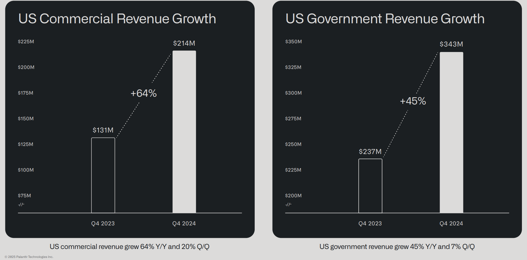 Palantir 是美国国防机构的主要软件和技术服务提供商,近年来更因 AI 平台而备受关注。随着与美国国防部的合作加深,其美国政府业务收入增长 45%,达到 3.43 亿美元。同时,美国商业收入增长 64%,达到 2.14 亿美元。