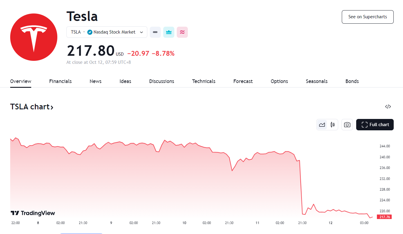 发布会直播期间,特斯拉股价夜盘一度涨超 5%,直播结束后,特斯拉转跌,一度跌 8.78%。