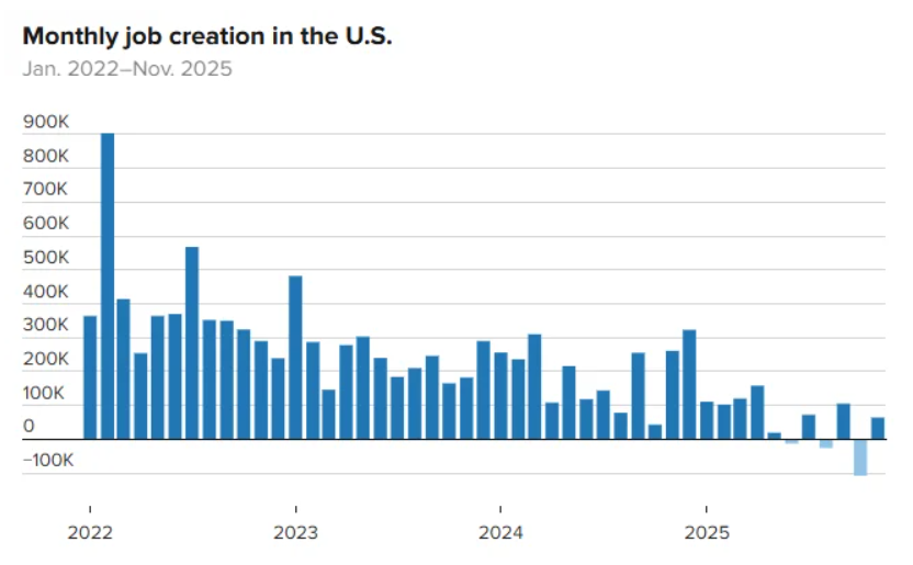 薪资增速亦有所放缓,平均时薪月增 0.1%,进一步强化市场对通胀压力减轻的预期。整体而言,数据并未改变华尔街对美联储 (Fed) 后续政策路径的判断,利率期货市场仍押注在 2026 年前将至少降息两次。