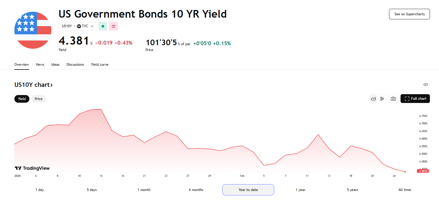 道琼斯市场的数据显示,目前 2 年期美债收益率已经跌至了去年 12 月 11 日以来的最低水平,而素有“全球资产定价之锚”之称的 10 年期美债收益率也已来到了 12 月 17 日以来的最低位。