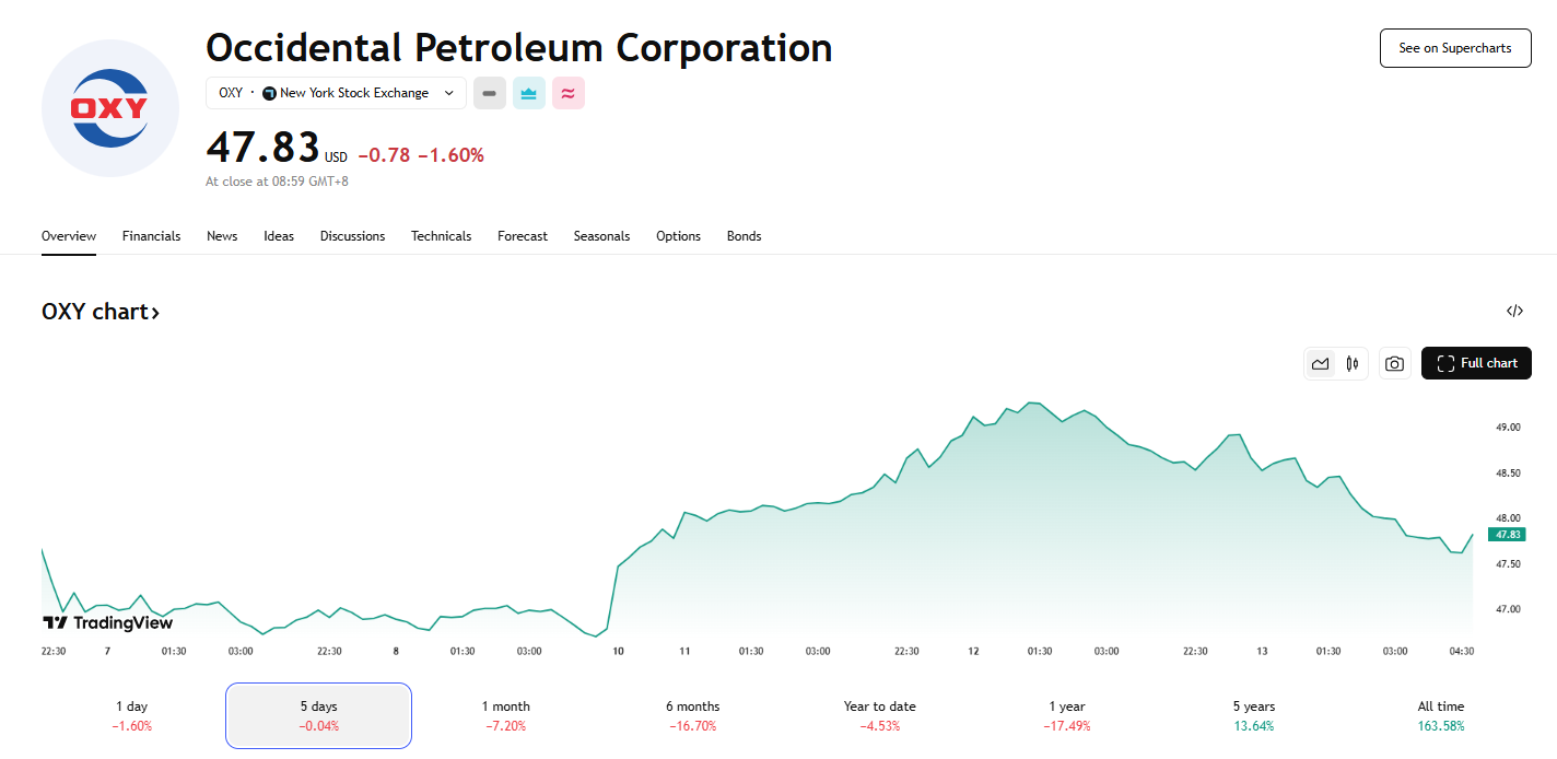 受此消息提振,西方石油(OXY.US)逆市走高,股价微涨 0.51%。