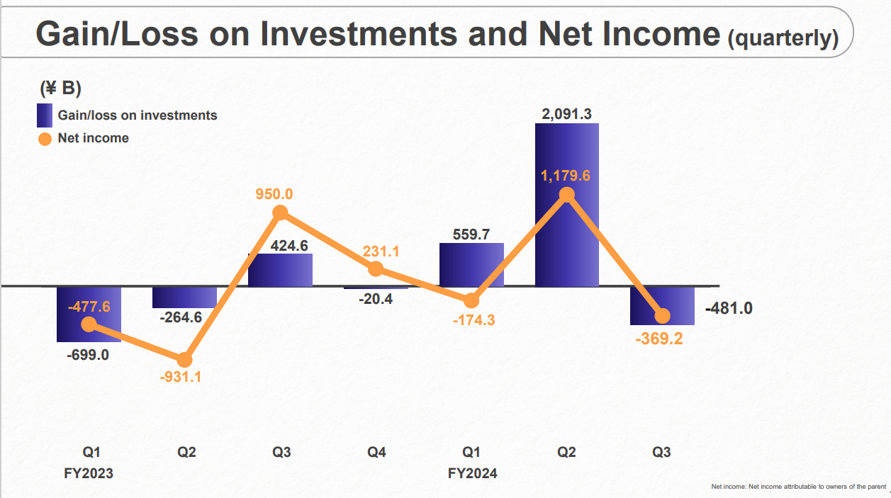 软银发布 2024 财年第三季度财报数据,受愿景基金(Vision Funds)投资表现不佳拖累,财报意外出现 3692 亿日元(约合 24 亿美元)亏损,而去年同期则为盈利 9500 亿日元。这一结果远逊于 LSEG SmartEstimate 预测的 2340 亿日元净利润。