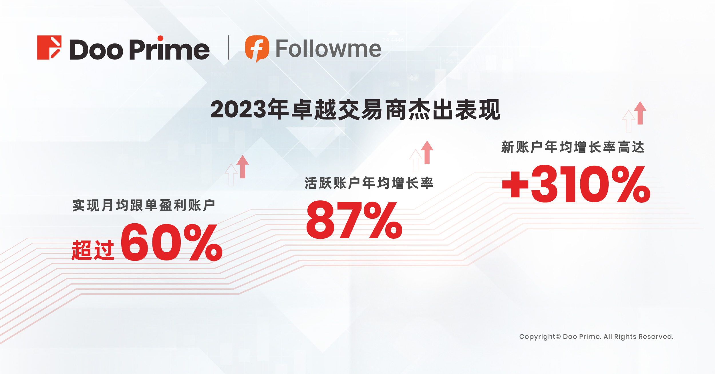 近三年来,Doo Prime 在 FOLLOWME 的新账户年均增长率高达 310%、活跃账户年均增长率达 87%,而且超过 60% 的账户实现月均跟单盈利。