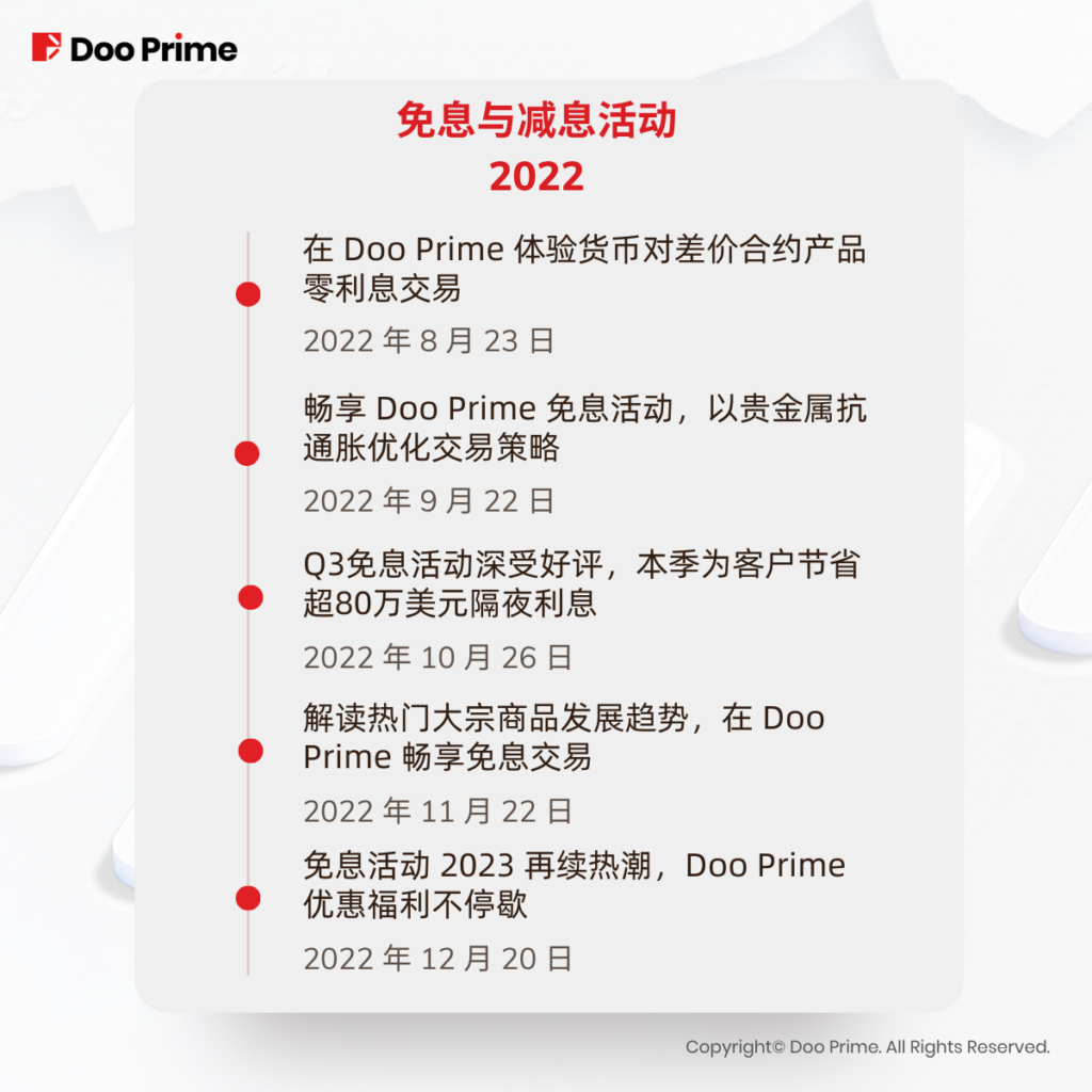 免息活动的首要目的,是帮助 Doo Prime 的客户以最低的交易成本与交易风险,达成最高的交易收益。Doo Prime 一直竭尽所能,在方方面面让客户受益。如欲了解更多有关免息活动的优惠福利,请点击这里阅读详情。