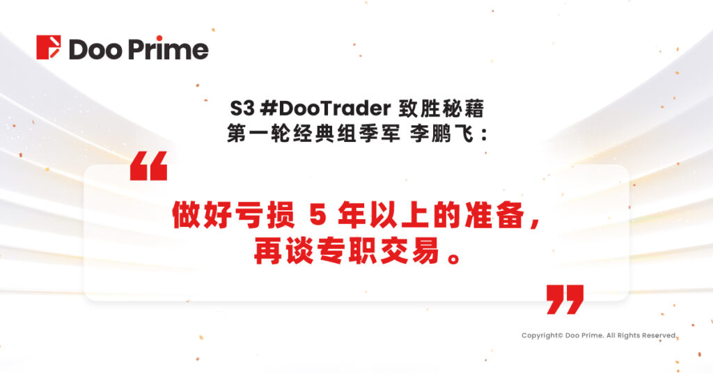 从第一轮赛事的战绩来看,大师组、经典组冠军分别达到了 875.52% 和 329.57% 的超高收益率。除了以上提到的获胜因素,通过和经典组季军李鹏飞的沟通后,我们发现优秀选手还有高超的交易技术,多年的实战经验以及自信果敢的决策执行力。Doo Prime 长期用户李鹏飞先生正是以多年的交易经验,实时调整交易风险预期,在可控范围内,持重仓博取高收益,在比赛中取得了优异成绩,赢得了 $1,500 丰厚奖金。