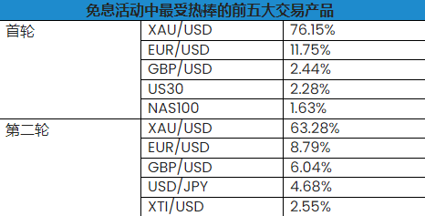 与上一轮免息活动相比,本轮活动中最受热捧的前五大产品为 XAU/USD、EUR/USD、GBP/USD、USD/JPY 以及 XTI/USD。