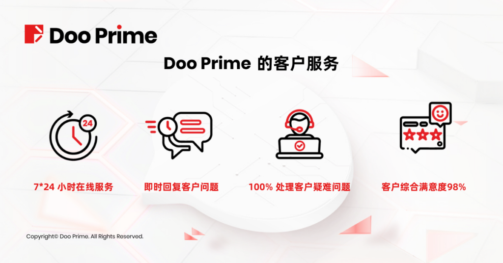 Doo Prime 的 7 * 24 小时在线客服即时回复问题,超过2分钟则会自动转接其他在线客服回复。100% 处理客户疑难问题,常见问题 1 分钟内即可协助客户完成处理,复杂特殊类问题,力求 5 分钟内协助客户完成处理。