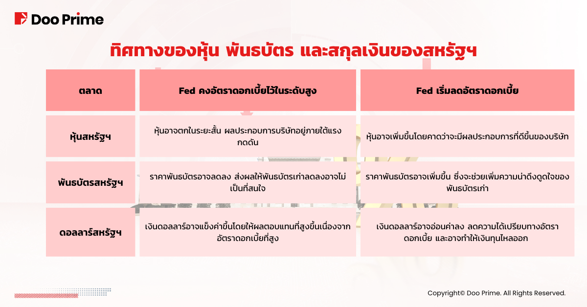 หากเฟดคงอัตราดอกเบี้ยที่สูงตามที่กำหนด ตลาดหุ้นกระทิงของสหรัฐฯ อาจยุติลง อัตราผลตอบแทนพันธบัตรสหรัฐฯ อาจเพิ่มขึ้นอีก และเงินดอลลาร์อาจแข็งค่าขึ้นต่อไป ในทางกลับกัน หากเฟดเข้าร่วมกับแนวโน้มการปรับลดอัตราดอกเบี้ยทั่วโลก หุ้นสหรัฐอาจยังคงเพิ่มขึ้นต่อไป ราคาพันธบัตรสหรัฐอาจเพิ่มขึ้น และเงินดอลลาร์อาจเริ่มอ่อนค่าลง