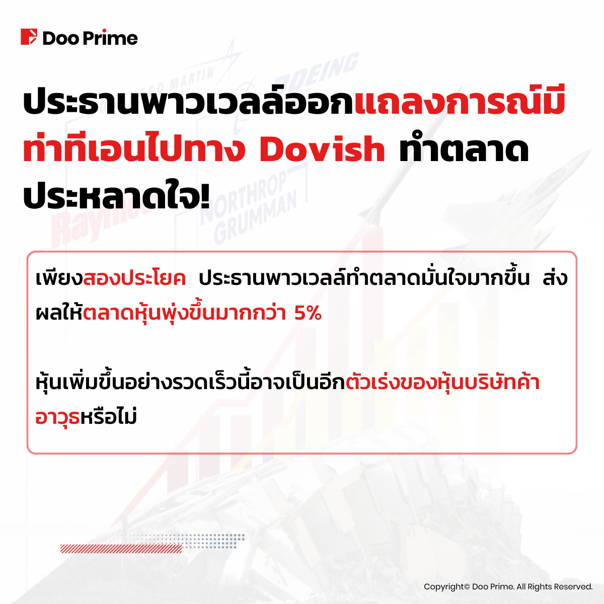 ข้อมูลนี้มีวัตถุประสงค์เพื่อให้ข้อมูลทั่วไปแก่สาธารณะเท่านั้น ข้อมูลไม่ควรถูกตีความเป็นคำปรึกษาทางด้านการลงทุน คำแนะนำ ข้อเสนอ หรือคำเชิญชวนเพื่อซื้อหรือขายเครื่องมือทางการเงินใด ๆ ข้อมูลที่นำเสนอในบทความนี้จัดทำขึ้นโดยโดยไม่มีการอ้างอิงหรือพิจารณาถึงจุดประสงค์การลงทุนหรือสถานะทางการเงินของผู้ใดผู้หนึ่งแต่อย่างใด การอ้างอิงถึงประสิทธิภาพของเครื่องมือทางการเงินในอดีต เครื่องมือทางการดัชนี หรือผลิตภัณฑ์การลงทุนไม่ใช่ตัวบ่งชี้ที่เชื่อถือได้สำหรับผลลัพธ์ในอนาคต Doo Prime ไม่รับรองและรับประกันข้อมูล และไม่รับผิดชอบต่อการสูญเสียหรือความเสียหายทั้งทางตรงและทางอ้อมอันเป็นผลมาจากความไม่ถูกต้องหรือความไม่สมบูรณ์ของข้อมูล Doo Prime ไม่รับผิดชอบต่อความสูญเสียหรือความเสียหายที่เป็นผลมาจากความเสี่ยงการซื้อขาย กำไร หรือขาดทุนทั้งทางตรงและทางอ้อมที่เกี่ยวข้องกับการลงทุนส่วนบุคคล