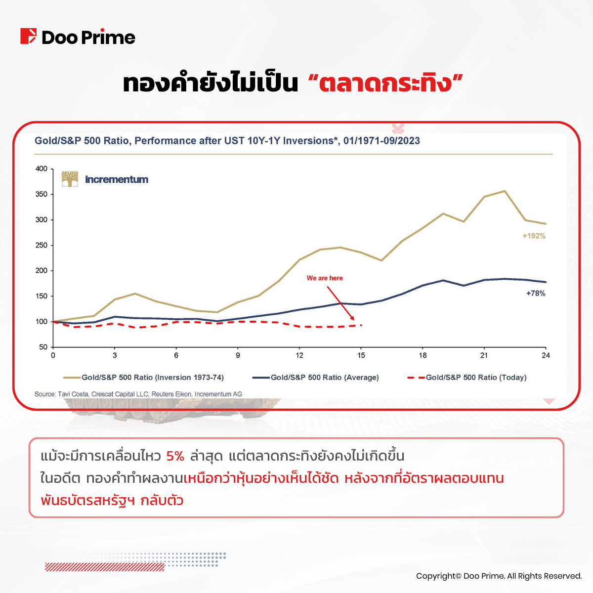 ภาวะกระทิงของตลาดทองคำยังคงนิ่งอยู่แม้ว่าจะมีการเพิ่มขึ้นอย่างรวดเร็วเมื่อเร็วๆ นี้ ตามแผนภูมิด้านล่างแสดงให้เห็นว่าทองคำมีประสิทธิภาพเหนือกว่าหุ้นอย่างชัดเจนหลังจากการกลับตัวของอัตราผลตอบแทนพันธบัตร