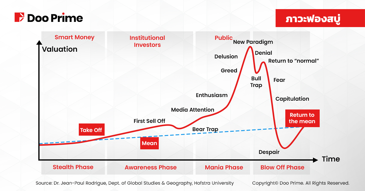 ฟองสบู่หรือความคลั่งไคล้ทางการเงิน มักเป็นไปตามรูปแบบที่กำหนดไว้อย่างชัดเจน ซึ่งกำหนดรูปแบบโดยประวัติศาสตร์เศรษฐกิจ 500 ปี แม้ว่าแต่ละวิกฤษจะมีเอกลักษณ์เฉพาะตัว แต่โดยทั่วไปแล้วฟองสบู่ในแต่ละครั้งจะมีลักษณะคล้ายๆ กันอยู่ 4 ขั้นตอน: