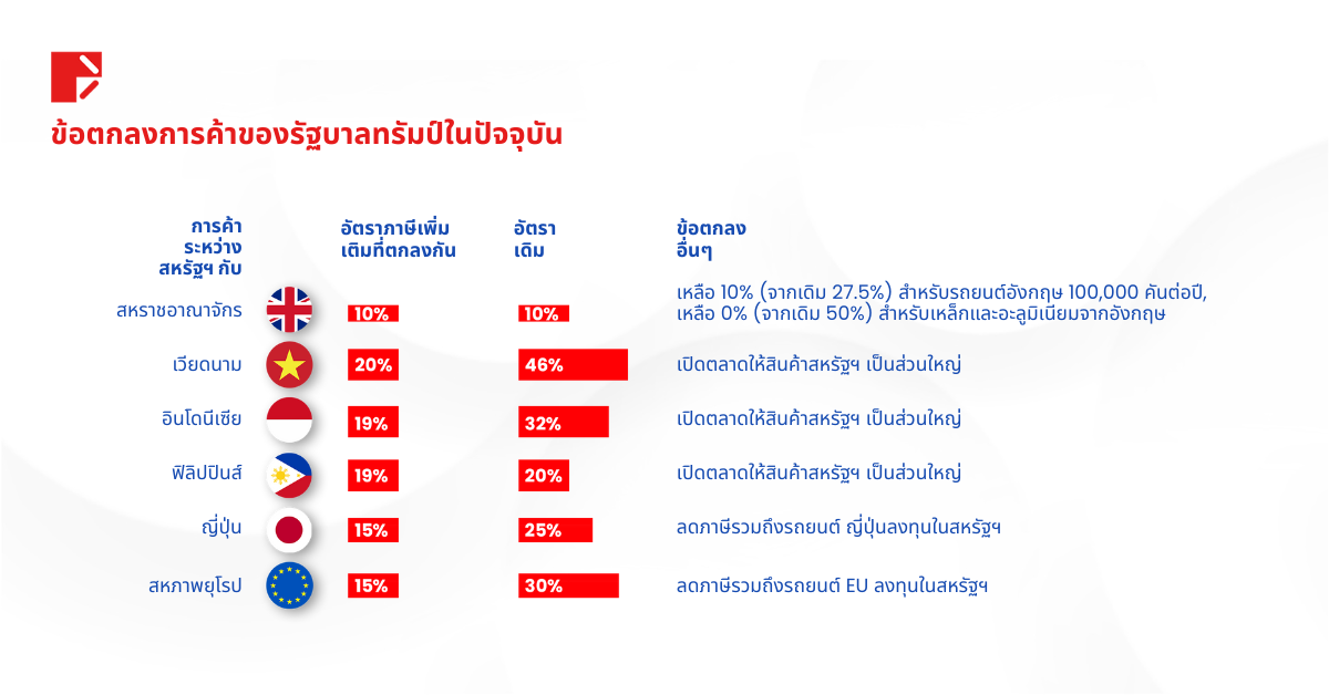 ตามที่แผนภูมิด้านล่างแสดง ตั้งแต่ประกาศขึ้นภาษีในเดือนเมษายน 2025 สหรัฐฯ ได้เซ็นหรือวางกรอบข้อตกลงการค้าใหม่กับ สหราชอาณาจักร เวียดนาม อินโดนีเซีย ฟิลิปปินส์ และญี่ปุ่น โดยแต่ละดีลมีการลดอัตราภาษีจากเดิม และเปิดทางให้สินค้าสหรัฐฯ เข้าสู่ตลาดได้มากขึ้น