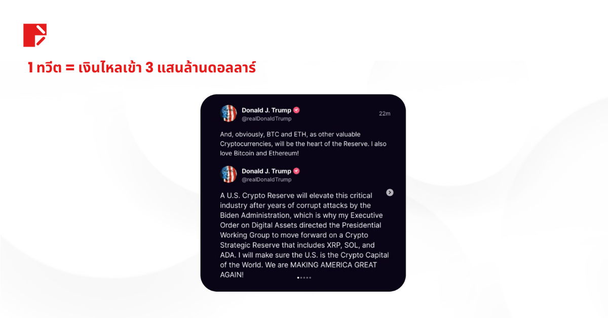 อยู่ๆ ทรัมป์ก็ทวีตโพสต์เดียว เงินกว่า 3 แสนล้านดอลลาร์ ไหลเข้าสู่ตลาดคริปโตภายในไม่กี่นาที Bitcoin ทะยานขึ้น Ethereum พุ่งตาม Altcoins ระเบิด นักลงทุนที่ Short ตลาดขาดทุนหนัก