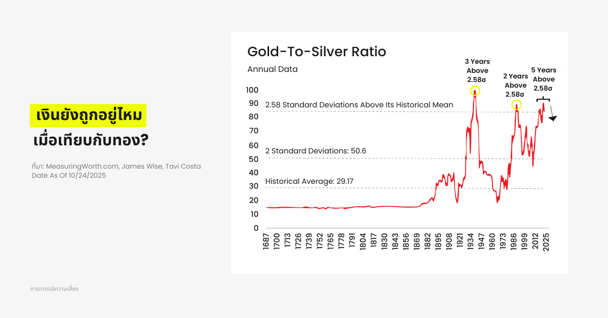 ดัชนี Gold-to-Silver Ratio คือตัววัดว่าต้องใช้เงินกี่ออนซ์เพื่อซื้อทองคำหนึ่งออนซ์ ตามประวัติศาสตร์แล้ว ค่าเฉลี่ยของดัชนีนี้มักจะต่ำกว่าระดับปัจจุบันมาก ถ้าระดับนี้ยังสูงอยู่ แปลว่าเงิน ยังถูกมากเมื่อเทียบกับทอง ถ้าระดับนี้ต่ำ แปลว่าเงินเริ่มแพงแล้ว