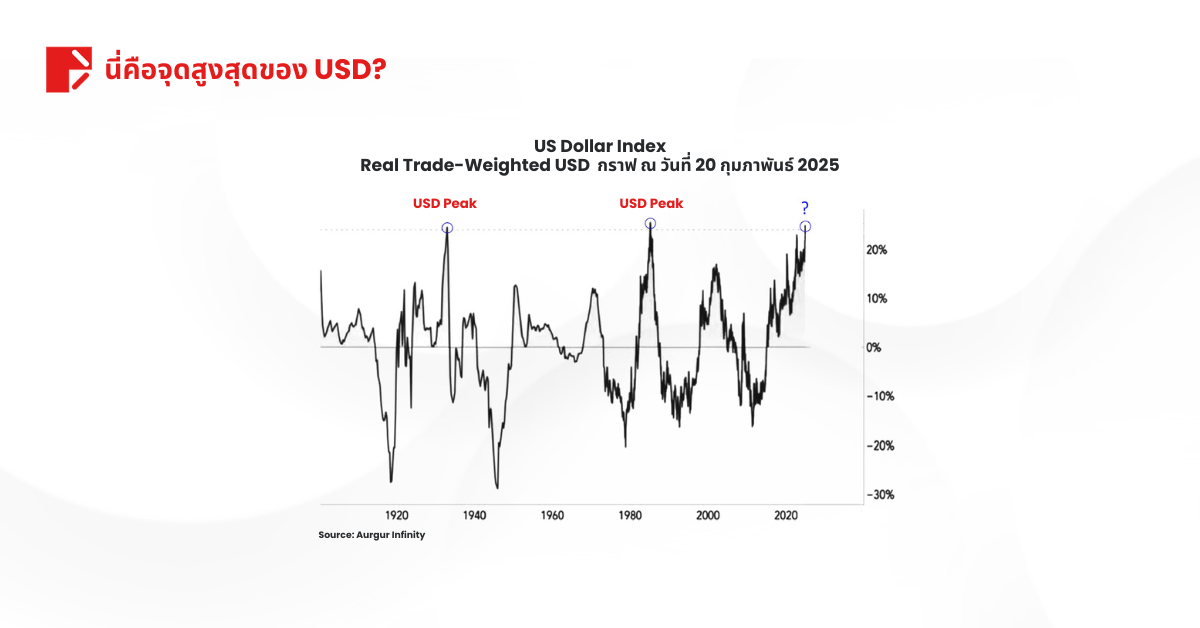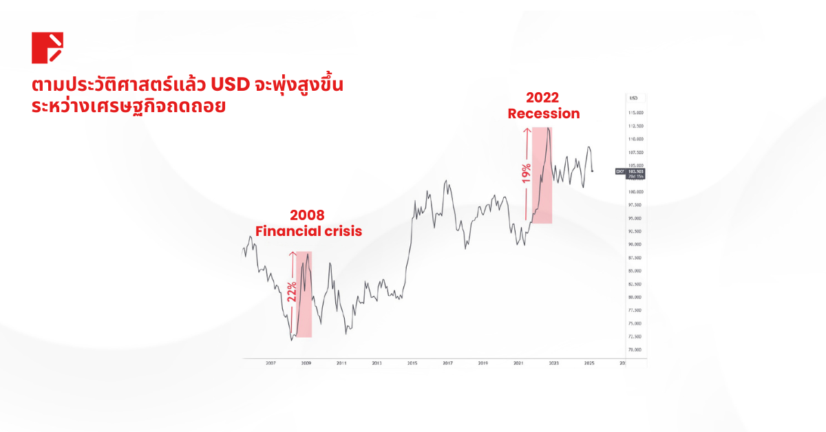 ลองย้อนดูวิกฤติที่ผ่านมา วิกฤตการเงินปี 2008 ดัชนีค่าเงินดอลลาร์สหรัฐฯ (DXY) พุ่งขึ้นกว่า 20% ช่วงโควิด-19 ปี 2020 ดอลลาร์แข็งค่าขึ้น 7% ภาวะเศรษฐกิจถดถอยปี 2022 ดอลลาร์แข็งค่าประมาณ 20% ปกติแล้วในอดีต ดอลลาร์ที่แข็งค่ามักเป็นสัญญาณเตือนภาวะถดถอย แต่ รอบนี้แตกต่างออกไป