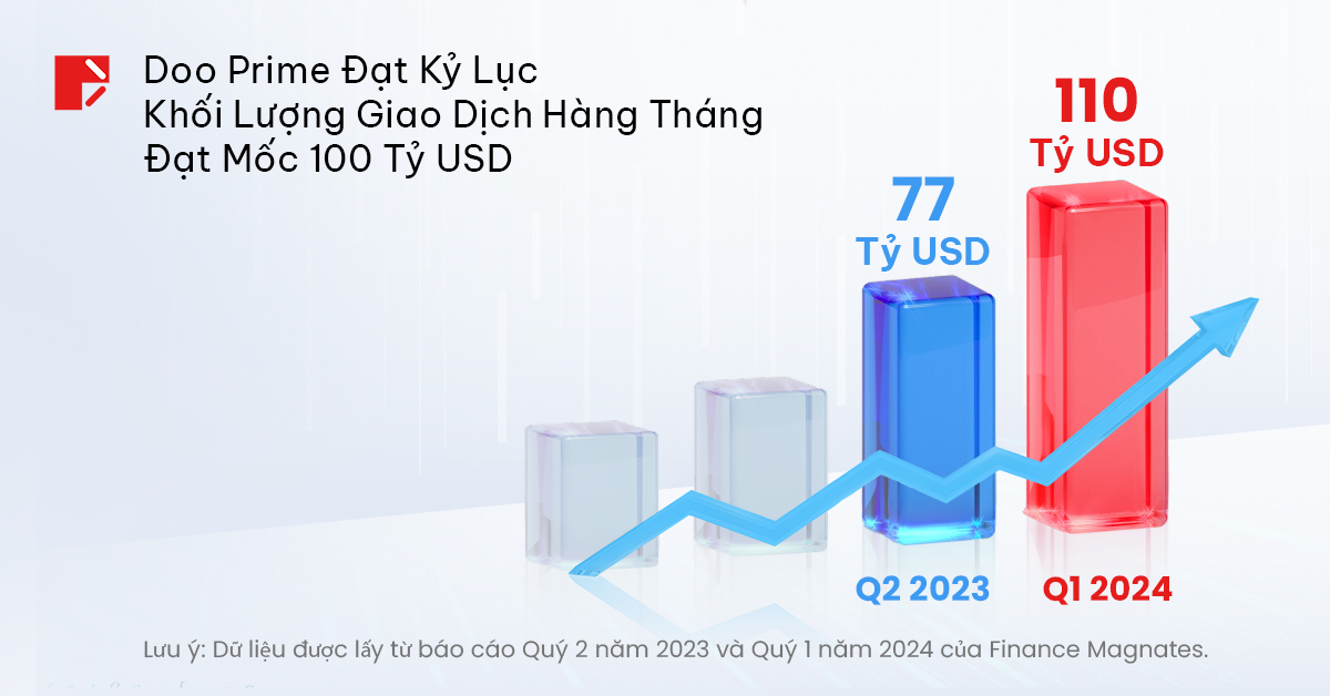 Cũng theo báo cáo này của Finance Magnates, khối lượng giao dịch của Doo Prime đã leo lên vị trí thứ 26 toàn cầu trong Q1 2024, mức tăng ấn tượng từ thứ hạng 35 hồi Q2 năm 2023. Thêm vào đó, khối lượng giao dịch hàng tháng cũng đạt mức 110 tỷ USD trong quý đầu năm nay.